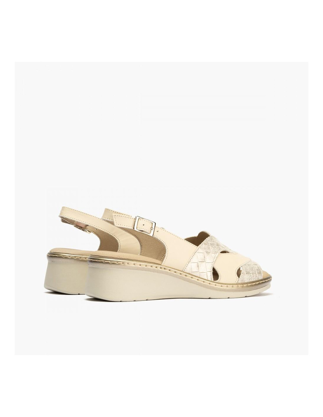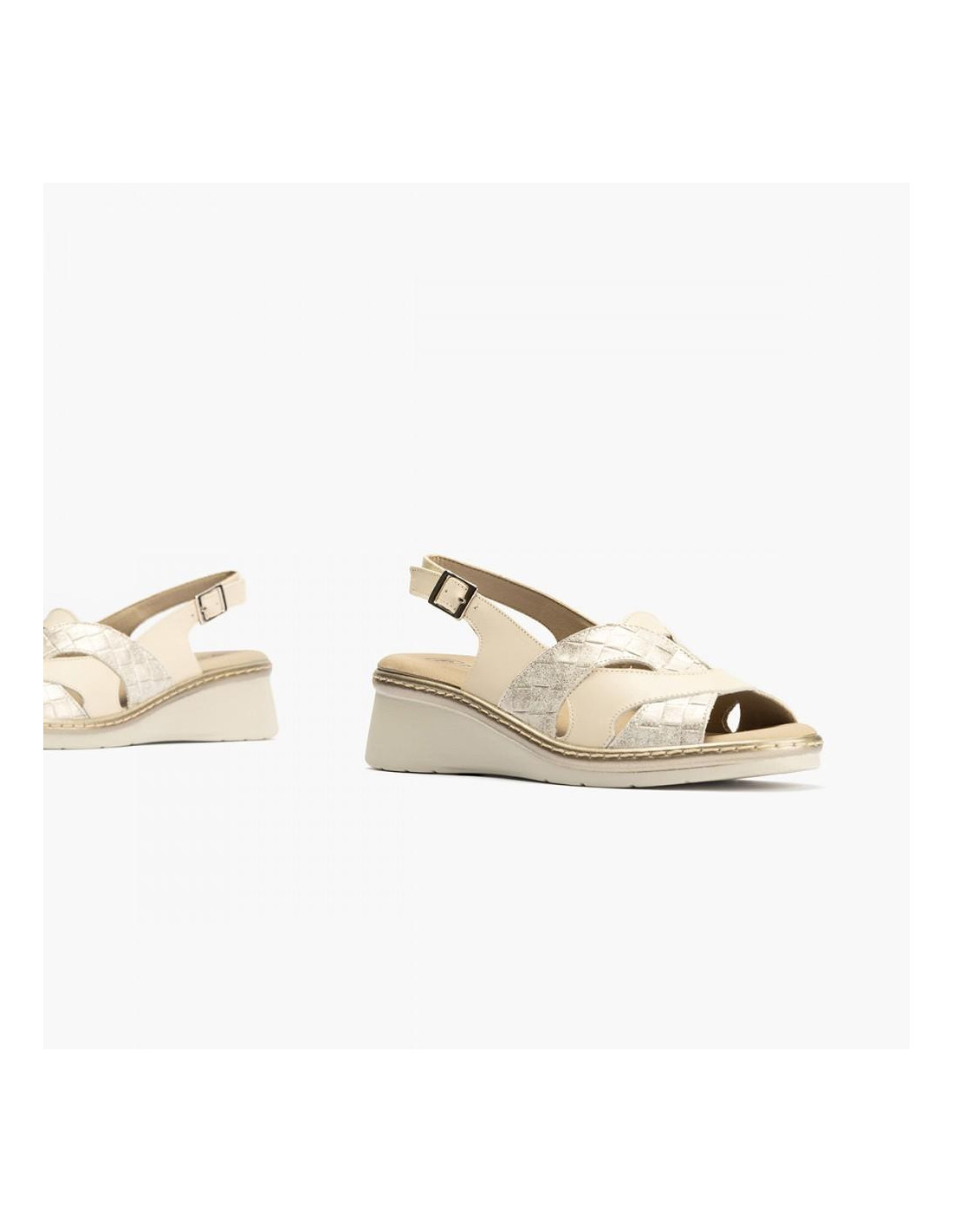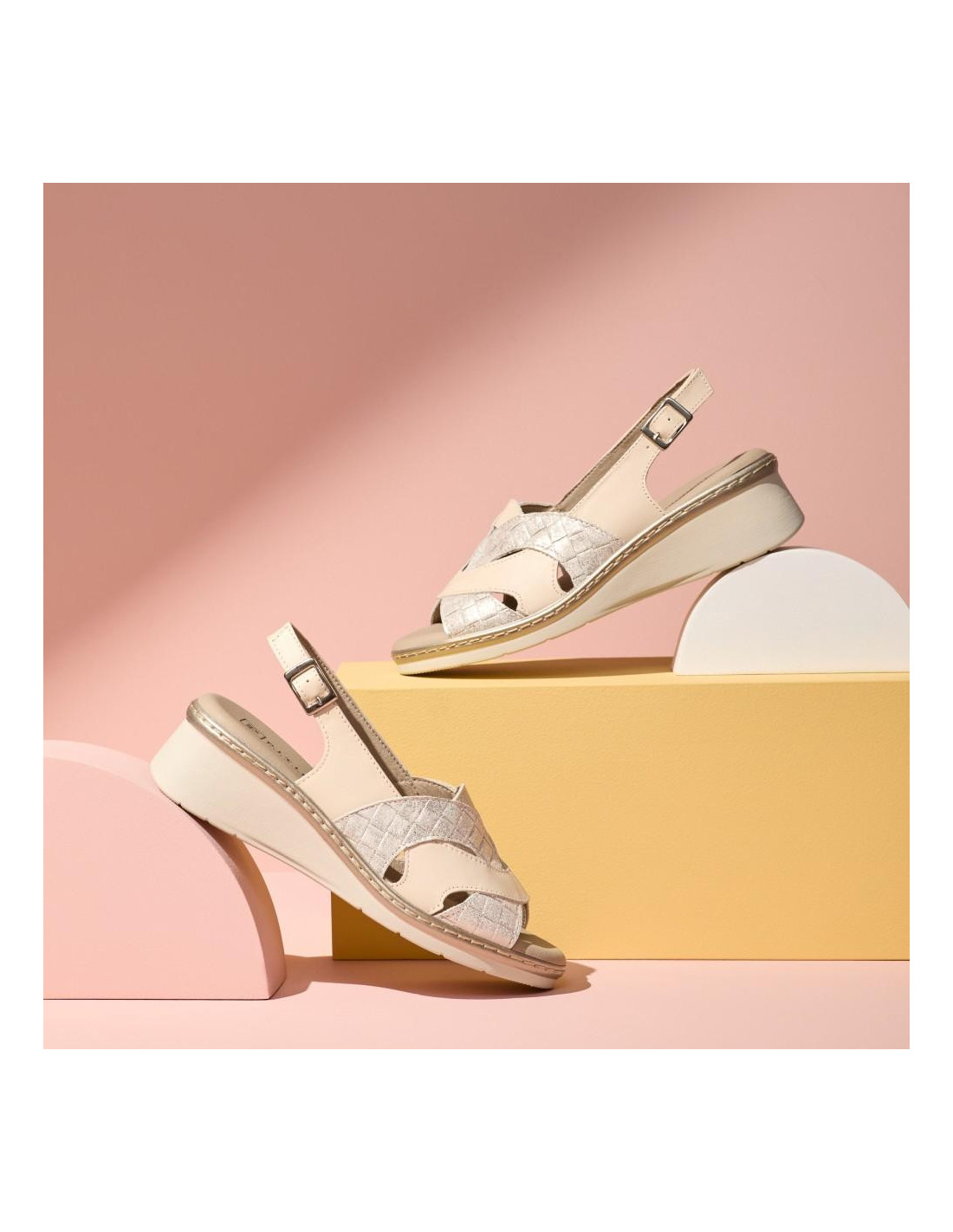 Sandalia de mujer con cuña alta pintada de tiras cruzadas en blanco: Fresca y moderna, esta sandalia en blanco presenta un diseño con tiras cruzadas pintadas que le otorgan un aspecto dinámico y versátil, perfecta para lucir un estilo urbano y actual.