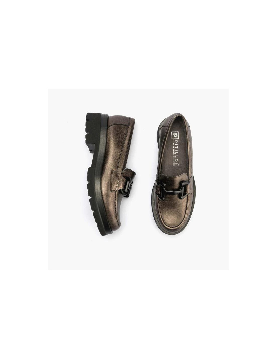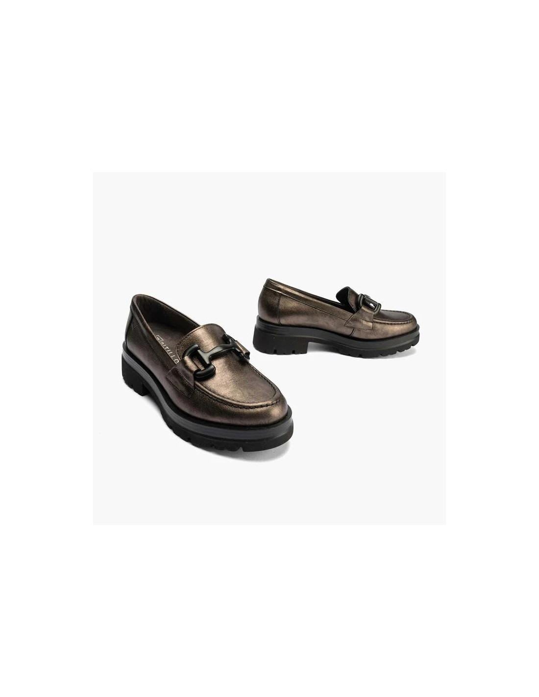 Mocasines de mujer destalonados en piel charol con adorno cadena metálica NEGRO.