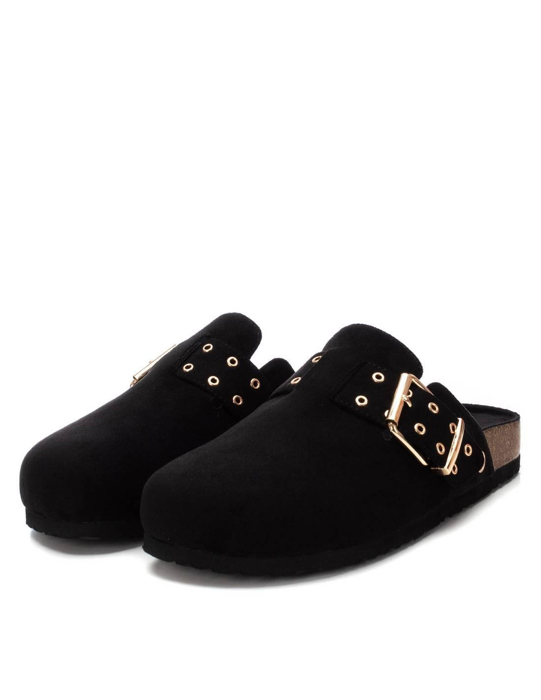 Zueco de mujer, de la marca Refresh. Fabricado en serraje. Correa con hebilla. Cómoda planta tipo bios con suela de goma antideslizante.