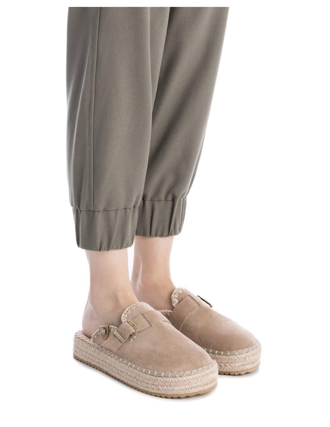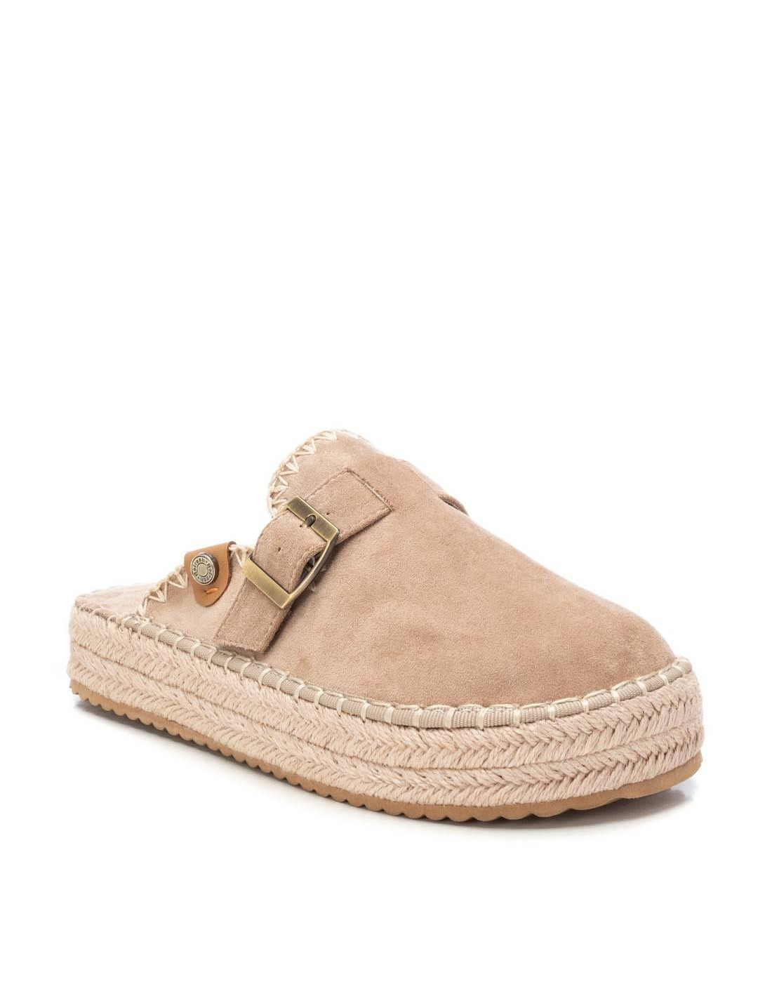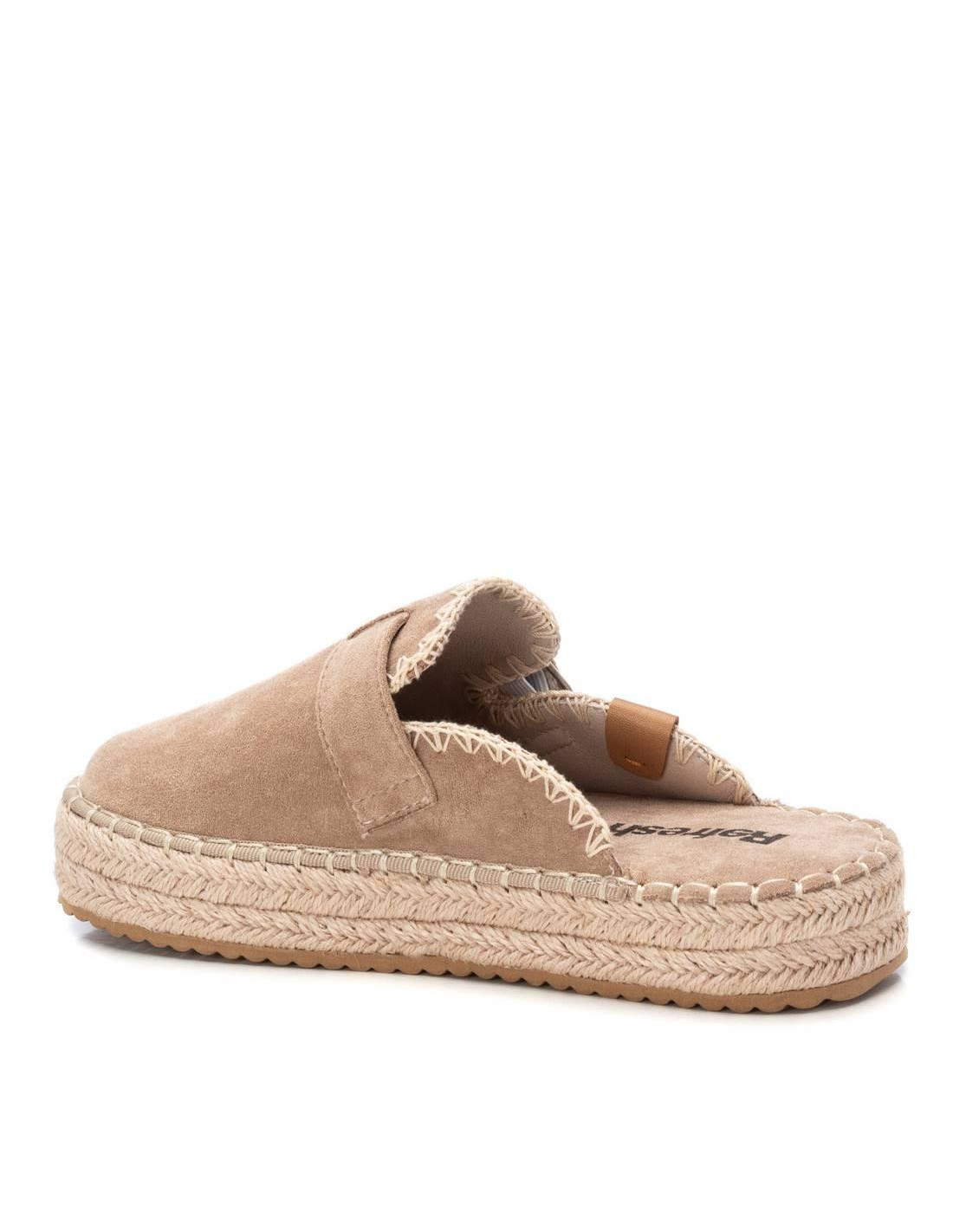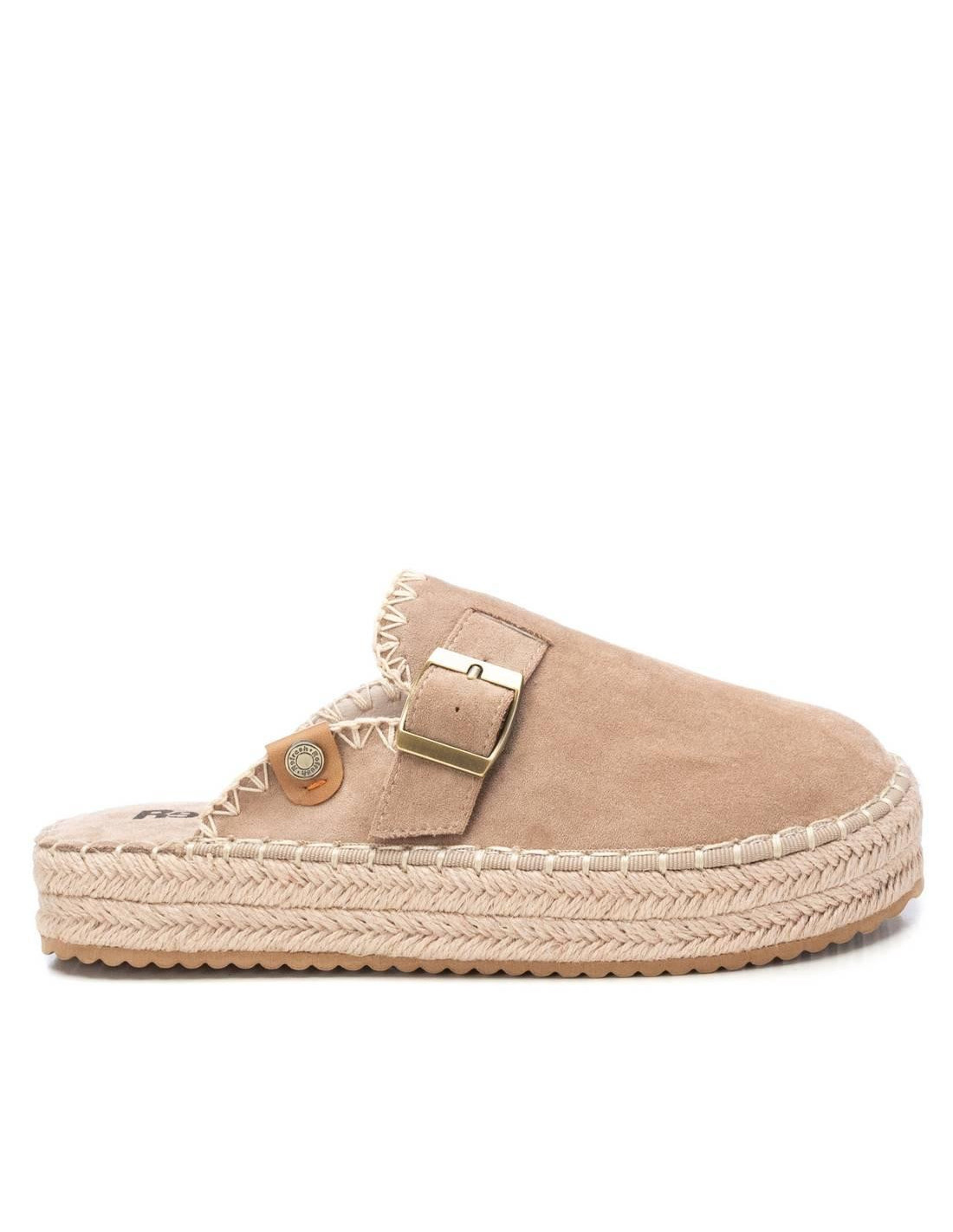 Zueco de la marca Refresh. Fabricado en suave antelina. Correa ajustable con hebilla. Cómoda planta. Plataforma recubierta en tiras de yute con suela canalada de goma antideslizante.