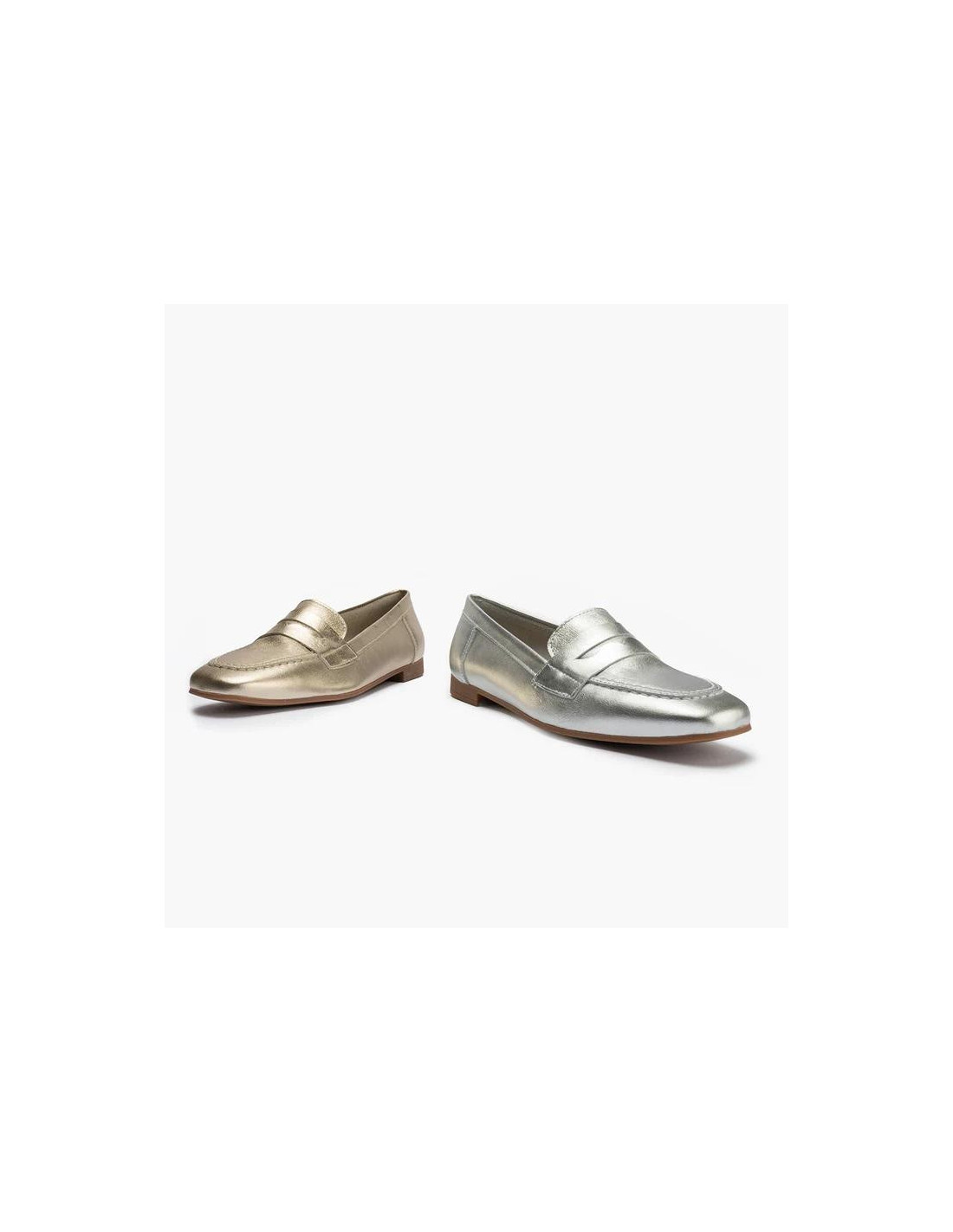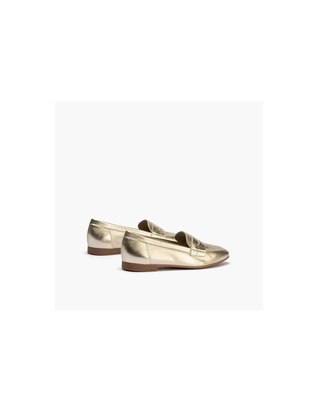 Mocasin mujer en piel laminado ORO. Pensado para ofrecer la máxima comodidad durante todo el día. La suela de tpu garantiza ligereza y resistencia. Incluye plantilla técnica textil para extra-confort y sensación térmica óptima esta primavera/verano. compuesta por fibras transpirables para máximo confort. Ideal para la temporada primavera - verano 2025.