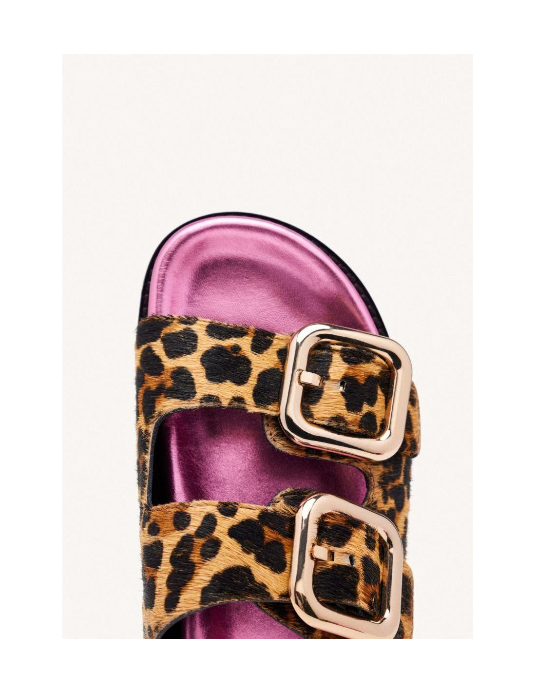 Sandalias de piel con hebillas y estampado animal. Cuentan con planta anatómica de microfibra forrada en piel metalizada, favoreciendo una posición correcta y evitando las sobrecargas musculares.