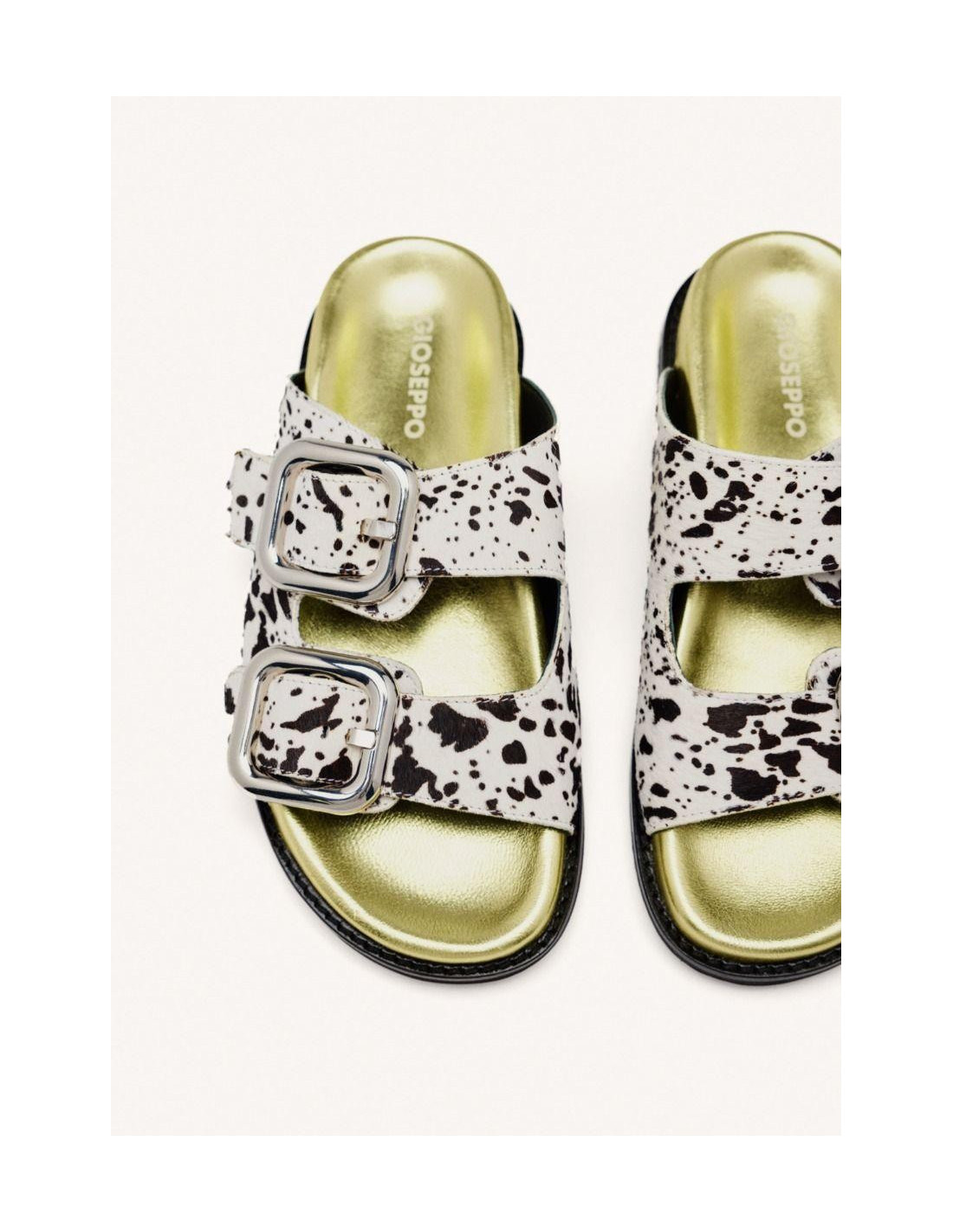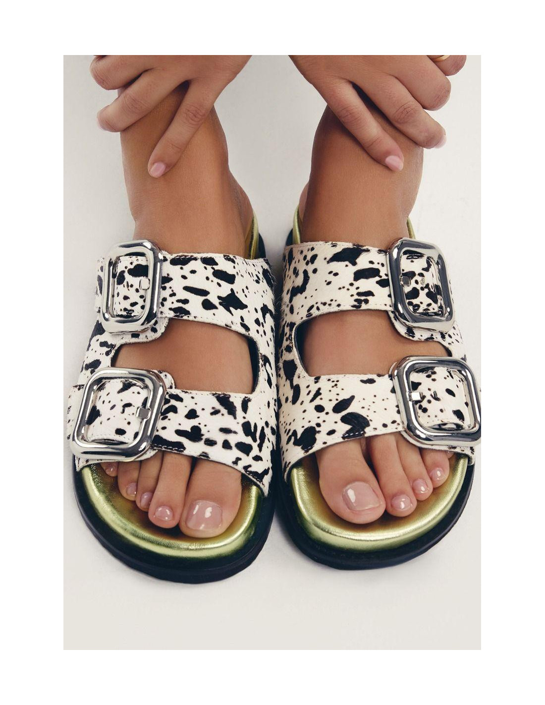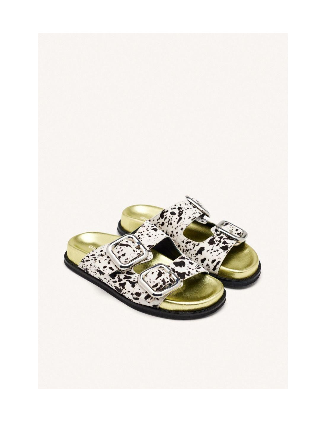 Sandalias de piel con hebillas y estampado animal. Cuentan con planta anatómica de microfibra forrada en piel metalizada, favoreciendo una posición correcta y evitando las sobrecargas musculares.